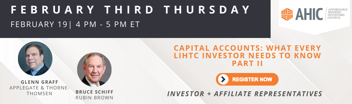 The Affordable Housing Investors Council promotes the equity investor's voice and perspective in the unique Low-Income Housing Tax Credit (LIHTC) partnership. It provides educational opportunities for investors and a forum to learn and share their insights on issues facing the field.
