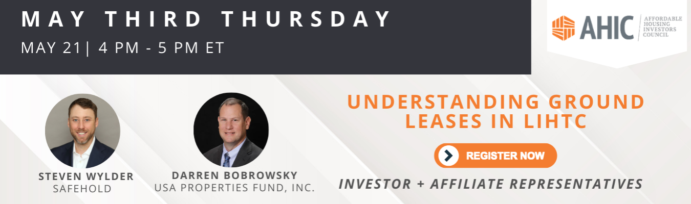 The Affordable Housing Investors Council promotes the equity investor's voice and perspective in the unique Low-Income Housing Tax Credit (LIHTC) partnership. It provides educational opportunities for investors and a forum to learn and share their insights on issues facing the field.